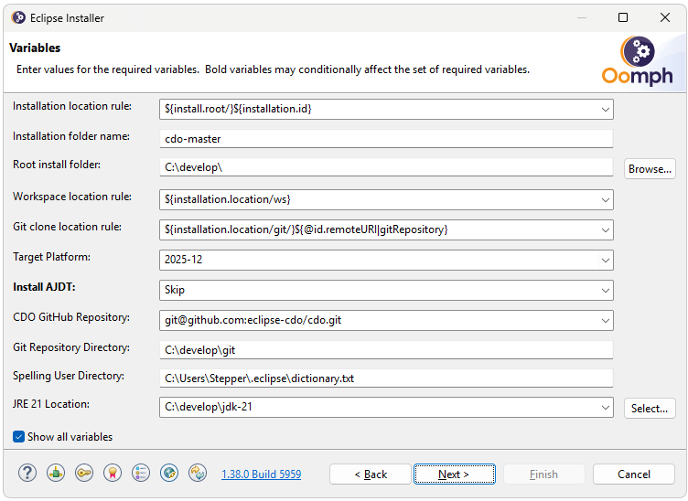 The installer will download and install the required Eclipse IDE packages, CDO, and all its dependencies. This may take a while depending on your internet connection speed. Once the installation is complete, the installer will launch the new IDE. Each time the IDE is started, it will check for updates and perform them automatically. Please refer to the Eclipse Installer documentation for details.