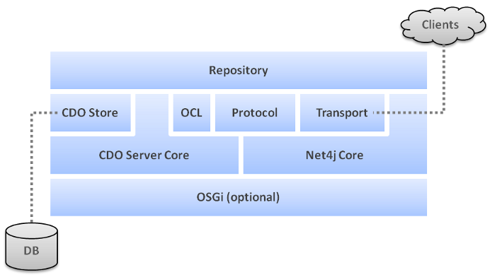 The main building block of a CDO repository is split into two layers, the generic repository layer that client applications interact with and the database integration layer that providers can hook into to integrate their data storage solutions with CDO. A number of such integrations already ship with CDO, making it possible to connect a repository to all sorts of JDBC databases, Hibernate, Objectivity/DB, MongoDB or DB4O.