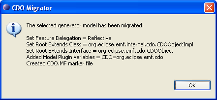 In case the generator model was successfully migrated to CDO the following dialog box will appear: